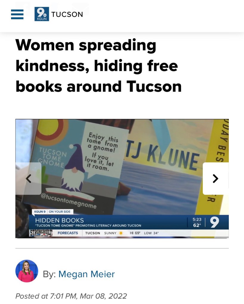 This gnome has more exciting news to share! Earlier this week (March 8), Tucson Tome Gnome was featured in KGUN9 in a wonderful story from reporter Megan Meier. You can watch the news story here!