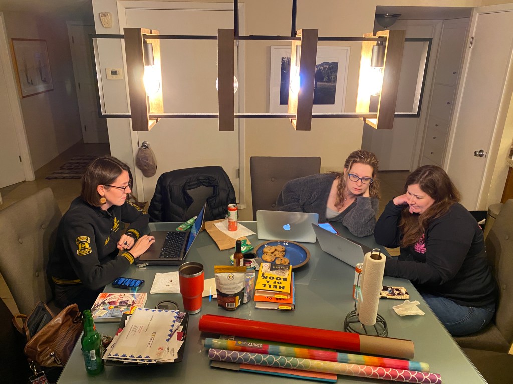Our weekly business meetings are always on Friday or Saturday nights, and we talk about all things TTG over take-out (burgers and pizza are ongoing favorites…) and treats (often homemade cookies courtesy of Mary Ellen!). The meetings *might* be an excuse for three friends to get together and gab once a week, but we also spend time updating the website, developing a plan for social media posts, and talking about (and selecting!) books to hide during upcoming months. We’ve also started spending time brainstorming new collaborations with local organizations and businesses – – – and we’re starting to think about what might be next to expand the work of TTG. We want to figure out how we can bring yet MORE surprise books to the Tucson community 🙂