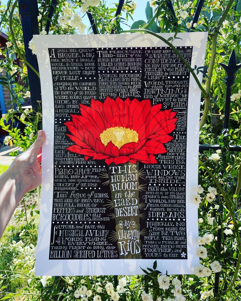 I hid 10 bundles of tomes around the Haiku Hike downtown and 20 tomes around town. Some photos from my adventure last weekend are included in the collage above. This time, ALL of the authors signed all of the books, and anyone who found a book bundle also received a coupon to pick up a beautiful broadside of Alberto Ríos’ poem, “This Human Bloom in the Hard Desert.”