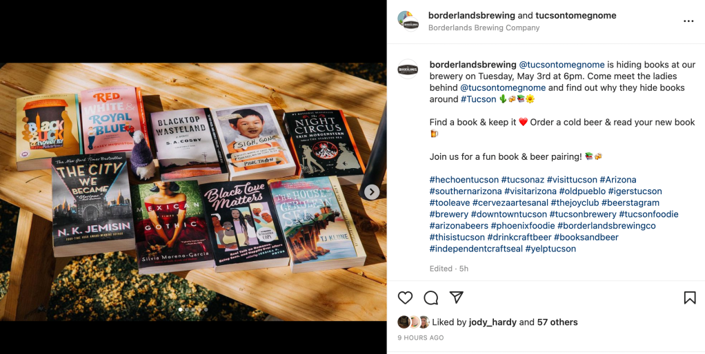 So, if you’re in Tucson and free this Tuesday, we would love to meet you at Borderlands. Come on down, search for a free book, and enjoy a cool beer. And don’t forget to stop by and say hello, snag a Tucson Tome Gnome sticker, and learn more about TTG’s mission to share free books with our Tucson community!