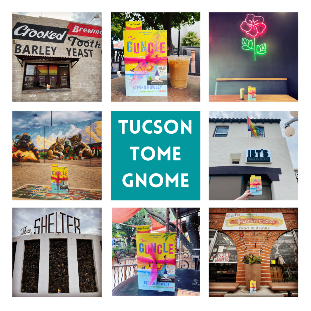 Wowza! During this tenth Tome Giveaway, I had a great day hiding books at so many amazing LGBTQ+ friendly businesses and establishments all over Tucson! Over the course of the day, I hid 30 copies of The Guncle by Steven Rowley. Some photos from my adventures last weekend are included in the collage above 🙂