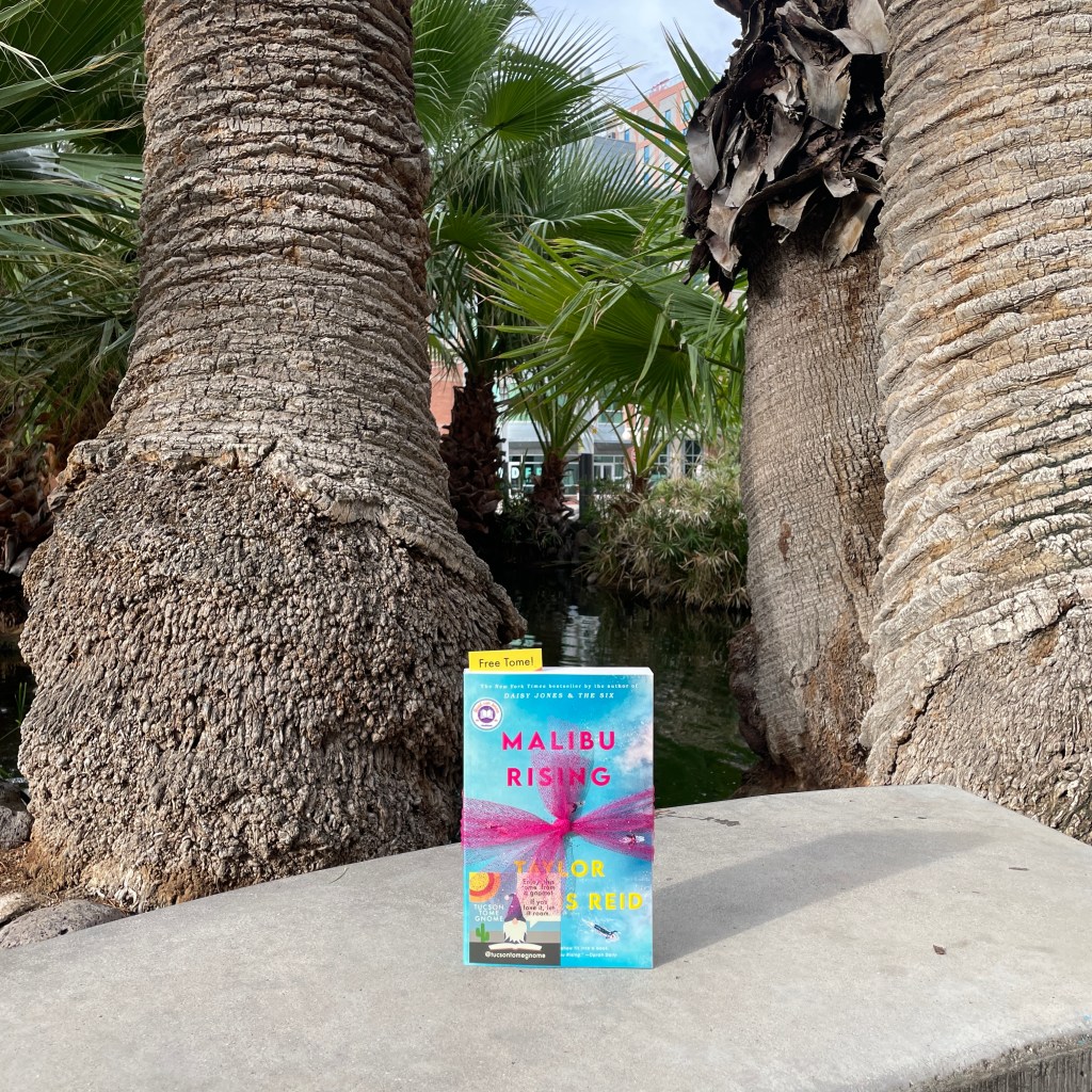 Wowza! During this eleventh Tome Giveaway, I had a great (albeit a little stressful…) day hiding books at wet and watery places all over Tucson (which really turned out to be everywhere, since it rained!). Over the course of the day, I hid 30 copies of Malibu Rising by Taylor Jenkins Reid. Some photos from my adventures last weekend are included in the collage above.