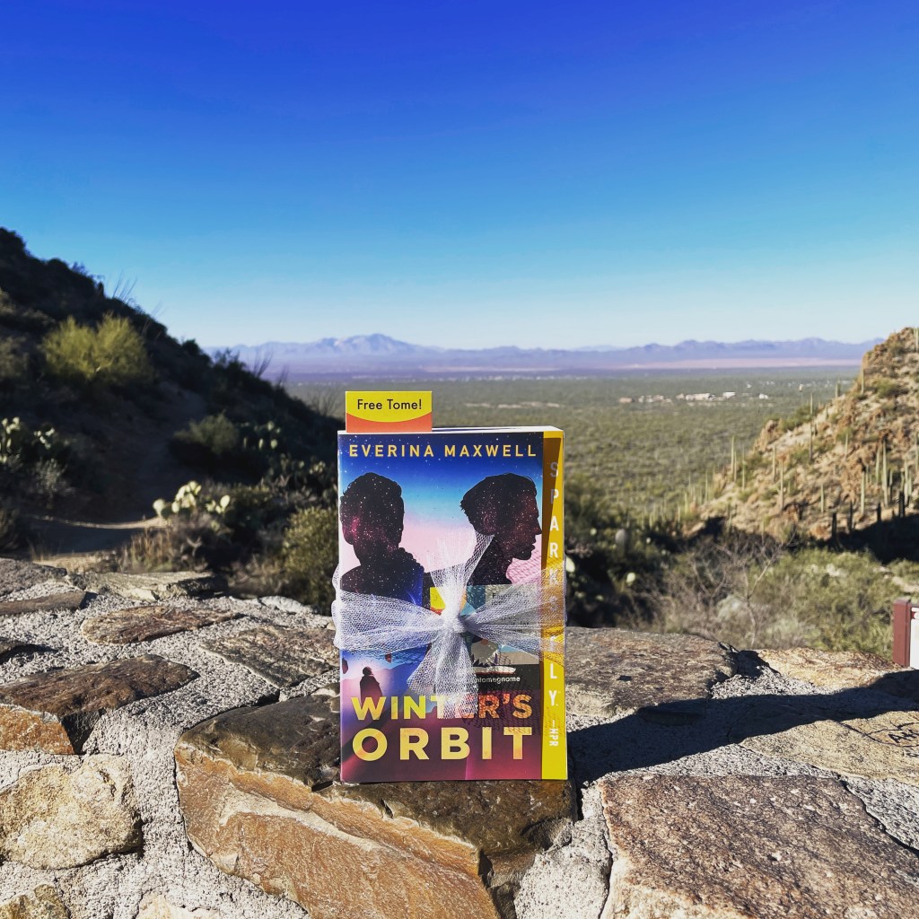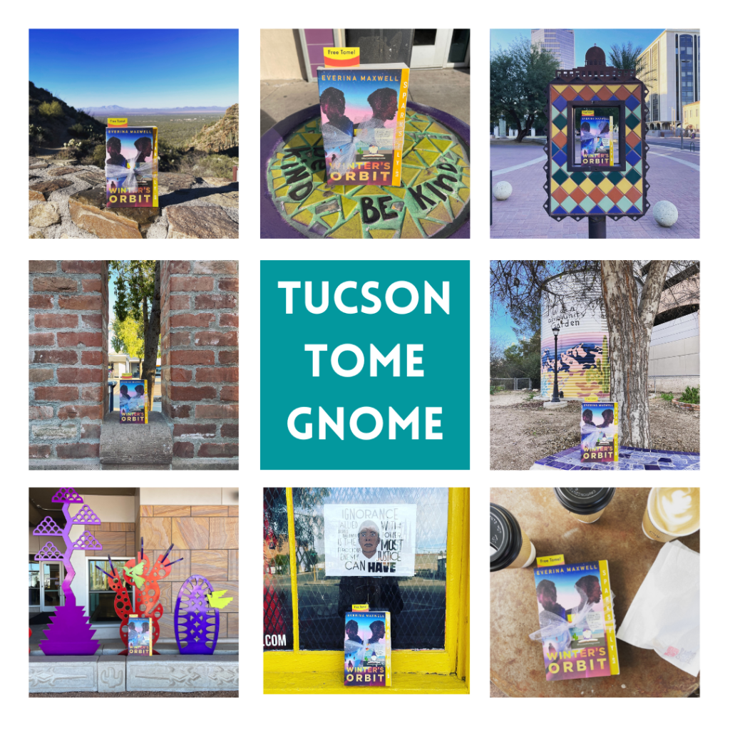 Wowza! During this seventeenth Tome Giveaway (and our first giveaway of 2023!), I had a wonderful day hiding tomes all over Tucson. Throughout the day, I hid 30 copies of Winter’s Orbit by Everina Maxwell. This is an amazing sci-fi/space opera story full of political intrigue and a lovely (sometimes frustrating, LOL) romance. This was the perfect book to share this month as the characters definitely spend some time in a chilly and snowy setting (speaking of snow, did you all get some this month? I was so excited by the rare snowy day!). I digress. Some of the photos from my adventures last weekend are included below – and in the collage above.