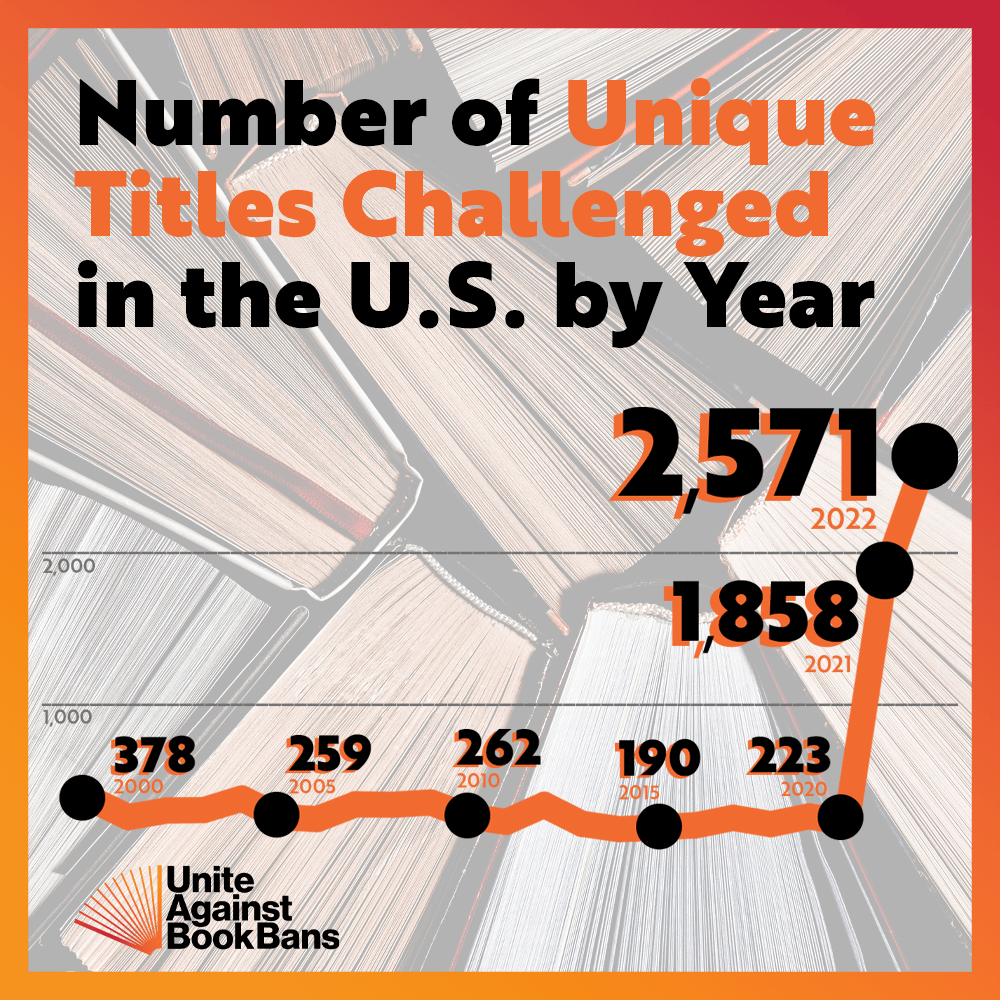 Just look at this (crazy? insane?) chart from Unite Against Book Bans reflecting the number of “challenged” books in 2022 compared to prior years: