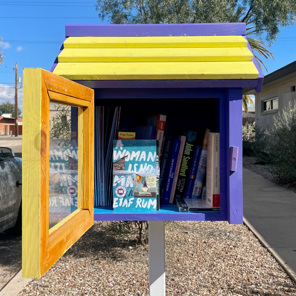 If you’re new here and didn’t get a chance to find a book last Sunday, I also hide an additional 15 books of each month’s selection (on top of the 30) around Tucson after the book-hiding weekend. So keep your eyes peeled over the next week or two, as 15 more copies of A Woman is No Man will be hidden around town! I do not post any hint photos of these books, as they are truly meant to be a random act of kindness for those who happen upon them. Yay for random bookish joy and delight!