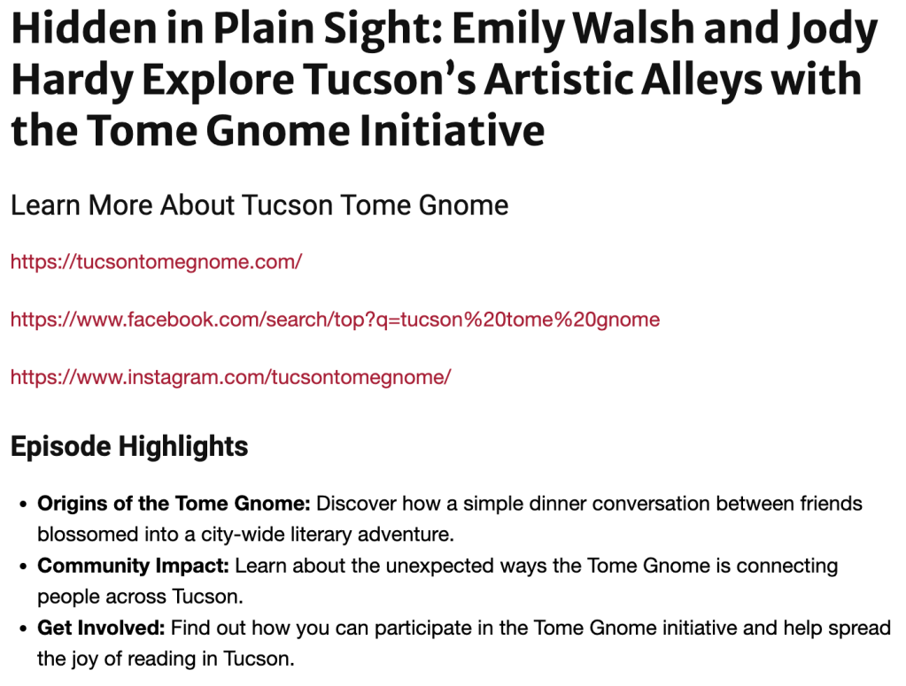 And then a week later, we sat down with Tom Heath, host of “Life Along the Streetcar,” in the Proper Shops in downtown Tucson for an interview! “Life Along the Streetcar” is a show that airs on Downtown Radio 99.1 FM. Tom’s show focuses on social, cultural, and economic topics impacting the lives of those who live, work, and/or play in Tucson’s urban core. It airs every Sunday at 11am – and our episode aired last Sunday, April 28 🙂 We had a great discussion about the Tome Gnome’s mission, how we select our books, and why we love hiding books all over downtown Tucson!