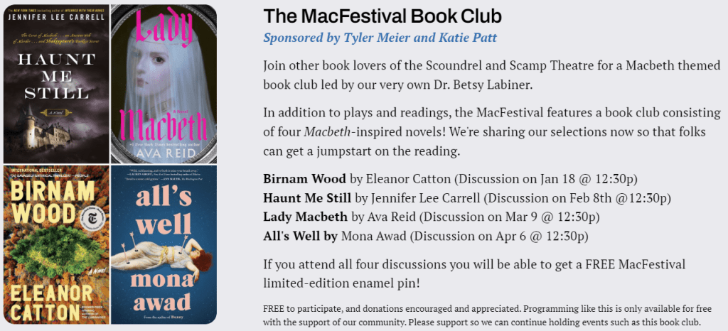 Running March 6th through April 27th, 2025 (please note, the book club kicks off in January, see above), The Scoundrel & Scamp Theatr will celebrate Macbeth, Shakespeare’s Scottish play and its myriad reimaginings, all of which examine the nature of power—and to what lengths we’ll go to attain and keep it. From the website: