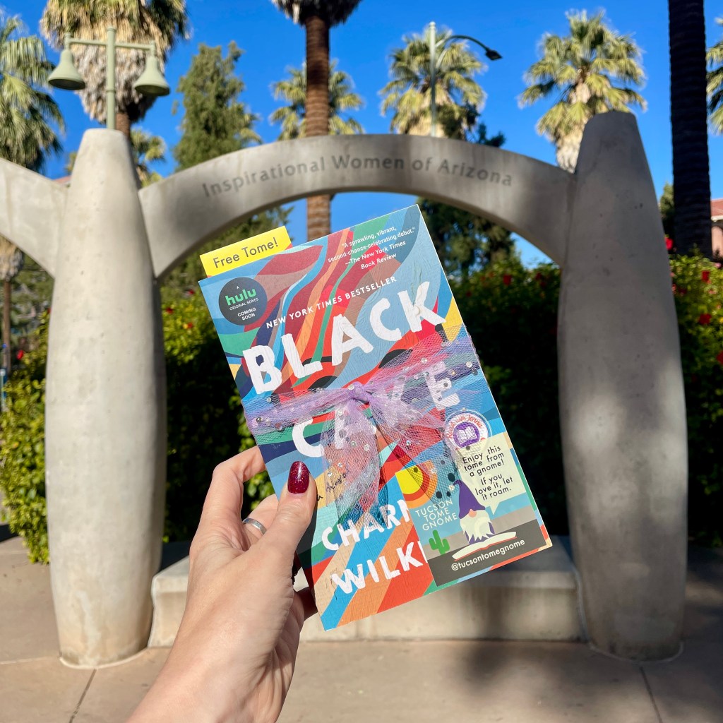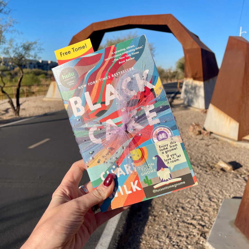 If you’re new here and didn’t get a chance to find a book last Sunday, some of our amazing guest gnomes will be hiding an additional 15 books of this month’s selection (on top of the 30) around Tucson over the next week or two. So keep your eyes peeled, as 15 more copies of Black Cake will be hidden around town! I do not post any hint photos of these books, as they are truly meant to be a random act of kindness for those who happen upon them. Yay for random bookish joy and delight!