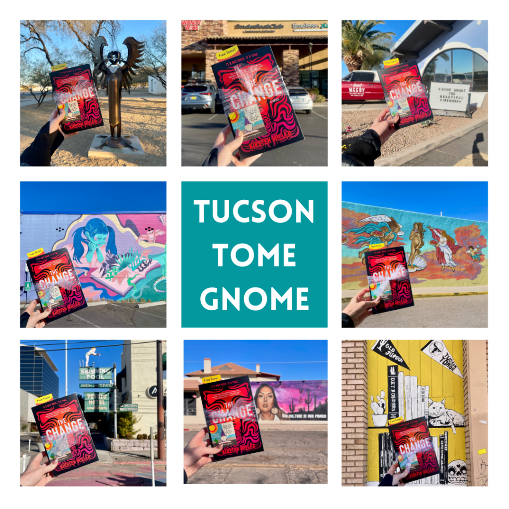 If you’re new here and didn’t get a chance to find a book last Sunday, some of our amazing guest gnomes will be hiding an additional 15 books of this month’s selection (on top of the 30) around Tucson over the next week or two. So keep your eyes peeled, as 15 more copies of The Change will be hidden around town! We do not post any hint photos of these books, as they are truly meant to be a random act of kindness for those who happen upon them. Yay for random bookish joy and delight!
