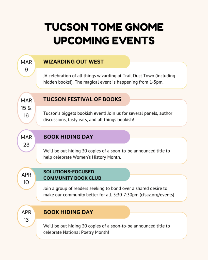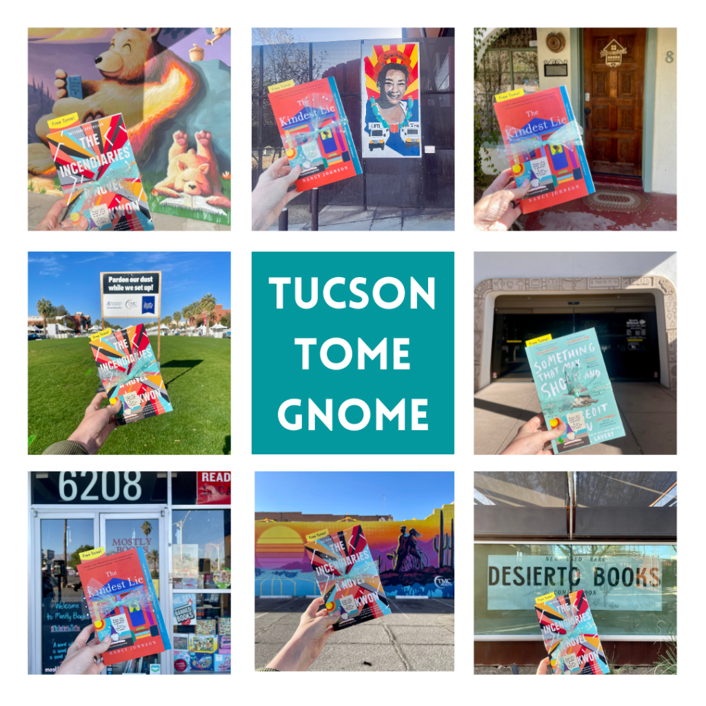 Friends: Last weekend, we had a blast hiding some books in partnership with our friends at the Tucson Spotlight! We hid 4 copies of each of the following 3 books to help build some hype up for the Tucson Festival of Books (all three of these authors will be joining us at the festival, so if you found a book, bring it to the festival and get it signed!):