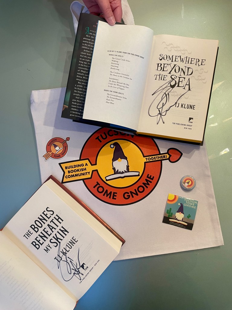 Each gift set included a Tome Gnome tote, a Tome Gnome button, two stickers, and two signed books from TJ Klune!!! Congratulations, winners!