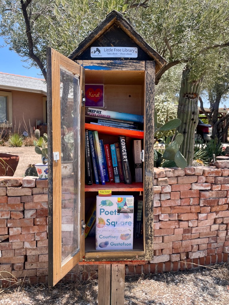 If you’re new here and didn’t get a chance to find a book on book-hiding day, some of our amazing guest gnomes are hiding an additional 15 books (on top of the 30) around Tucson over the next few weeks. So keep your eyes peeled, as 15 more copies of Poets Square are being hidden around town! We do not post any hint photos of these books, as they are truly meant to be a random act of kindness for those who happen upon them. Yay for random bookish joy and delight!