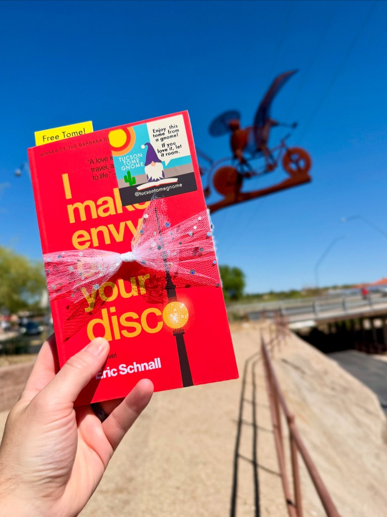 Happy 46th book giveaway! We celebrated Pride Month (June) by hiding 30 copies of I Make Envy On Your Disco by Eric Schnall. This gnome loved this book SO MUCH. It will transport you straight to Berlin in the mid-aughts. If you’re looking for a queer-friendly tale of found family and friendship set in a cooler climate (well, certainly cooler than June in Tucson…), then this book is for you. You can read more about why we selected this book here.
