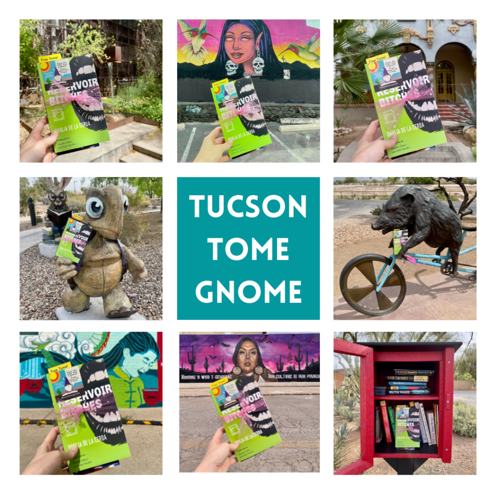 If you’re new here and didn’t get a chance to find a book on book-hiding day, some of our amazing guest gnomes are hiding an additional 20 books (on top of the 30) around Tucson over the next few weeks. So keep your eyes peeled, as 20 more copies of Reservoir Bitches are being hidden around town! We do not post any hint photos of these books, as they are truly meant to be a random act of kindness for those who happen upon them. Yay for random bookish joy and delight!